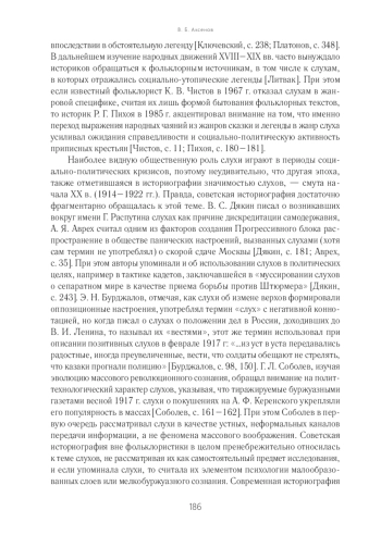 Историческая руморология — относительно молодое направление гуманитарного знания, хотя отечественная историческая наука еще с XIX в. «знает» феномен слухов. Прежде всего тема слухов всплывала на мате‑ риале Смутного времени XVII в., когда историки писали об их влиянии на политические события. Так, Н. М. Карамзин подозревал Г. Отрепьева в том, что тот в политических целях «распускал темную молву» о чудесном спасе‑ нии царевича Дмитрия; впоследствии Ю. В. Готье был менее категоричен в вопросах авторства этого слуха, но соглашался с тем, что молва «облегчала появление дальнейших самозванцев» [Карамзин, с. 118; Готье, с. 120]. Тем самым отмечалось, что слухи формировали общественное мнение, предопределявшее политические сценарии. Кроме того, слухи интересовали историков в контексте критики исторических источников, в результате чего описывалась трансформация одного фольклорного жанра в другой.