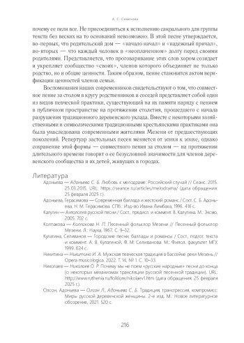 12. Семенова А. С. Традиционный песенный фольклор в репертуаре мезен ских хоров // Ученые записки Петрозаводского государственного универ ситета. 2025. Т. 47, № 1. С. 102-112.