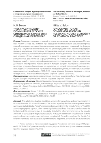 Синодики-помянники — важный источник по генеалогии и коммеморации Московской Руси XV–XVII вв. Тем не менее при обращении к ним возникают серьезные вопросы, главный из которых: чьи имена были включены в состав «родовых» поминаний (по формуле «род N»). Популярное мнение гласит, что это кровные родственники. Такой взгляд нередко приводил к курьезным родословным построениям и ощутимо искажал (да и попросту ограничивал) информационный потенциал синодиков. Анализ рукописных помянников показывает, что дело обстоит намного сложнее. На примере «родов» ряда лиц — как церковных (митрополитов, двух игуменов, старца, протопопа), так и светских (князя, старомосковского боярина, дьяка) — видна широчайшая вариативность поминальных практик, характерных для России эпохи раннего Нового времени. Которая, вопреки поспешным заключениям некоторых историков, была отнюдь не «курьезом», но нормой религиозной практики русских людей XV–XVII столетий. В приложениях помещены публикации поминальных записей кирилловского игумена Досифея (1533–1539), старца Мисаила Короваева (середина — третья четверть XVI в.) и волоколамского игумена Евфимия Туркова (1575–1587)