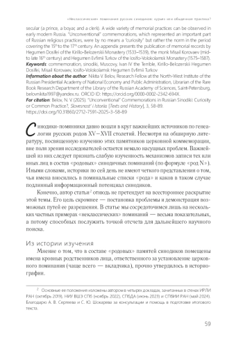 Синодики-помянники давно вошли в круг важнейших источников по генеалогии русских родов XV–XVII столетий. Несмотря на обширную литературу, посвященную изучению этих памятников церковной коммеморации, вне поля зрения исследователей остается немало насущных проблем. Важнейшей из них следует признать слабую изученность механизмов записи тех или иных лиц в состав «родовых» синодичных поминаний (по формуле «род N»). Иными словами, историки по сей день не имеют четкого представления о том, чьи имена вносились в поминальные списки «рода» и каков в таком случае подлинный информационный потенциал синодиков