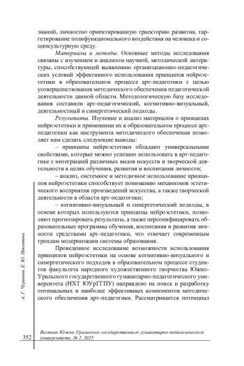 Результаты. Изучение и анализ материалов о принципах нейроэстетики и применении их в образовательном процессе арт-педагогики как инструмента методического обеспечения позволяет нам сделать следующие выводы: - принципы нейроэстетики обладают универсальными свойствами, которые можно успешно использовать в арт-педагогике с интеграцией различных видов искусств и творческой деятельности в целях обучения, развития и воспитания личности; - анализ, системное и методичное использование принципов нейроэстетики способствует пониманию механизмов эстетического восприятия произведений искусства, а также творческой деятельности в области арт-педагогики; - когнитивно-визуальный и синергетический подходы, в основе которых используются принципы нейроэстетики, позволяют прогнозировать результаты, а также персонифицировать образовательные программы обучения, воспитания и развития личности средствами арт-педагогики, что отвечает современным трендам модернизации системы образования. Проведенное исследование возможности использования принципов нейроэстетики на основе когнитивно-визуального и синергетического подходов в образовательном процессе студентов факультета народного художественного творчества Южно-Уральского государственного гуманитарно-педагогического университета (НХТ ЮУрГГПУ) направлено на поиск и разработку оптимальных и наиболее эффективных компонентов методического обеспечения арт-педагогики. Рассматривается потенциал когнитивно-визуального и синергетического подходов в контексте повышения качества образования и мотивации студентов к получению углубленных и качественных знаний и компетенций. Установлена универсальность и действенность принципов нейроэстетики в различных видах искусства и творчества, способствующих формированию и развитию у студентов общих эстетических ценностей, более глубокому пониманию философии искусства, а также своего мировоззрения.