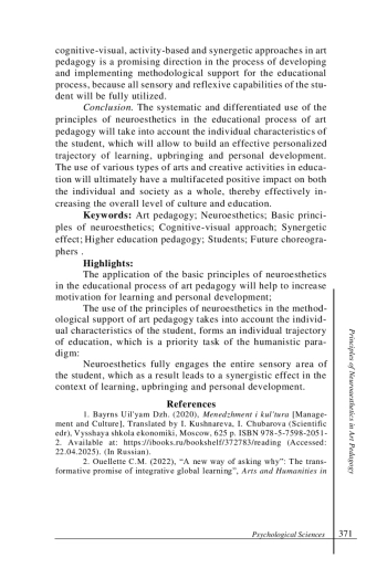 Заключение. Системное и дифференцированное использование принципов нейроэстетики в образовательном процессе арт-педагогики будет учитывать индивидуальные особенности обучающегося, что позволит выстроить эффективную персонифицированную траекторию обучения, воспитания и развития личности. Использование различных видов искусств и творческой деятельности в образовании, в конечном итоге, окажет многогранное положительное воздействие как на личность в отдельности, так и на общество в целом, эффективно повышая тем самым общей уровень культуры и образования. Основные положения: - применение базовых принципов нейроэстетики в образовательном процессе арт-педагогики будет способствовать повышению мотивации к обучению и развитию личности; - использование принципов нейроэстетики в методическом обеспечении арт-педагогики учитывает индивидуальные особенности обучающегося, формирует индивидуальную траекторию образования, что является приоритетной задачей гуманистической парадигмы; - нейроэстетика максимально полно задействует всю сенсорную область обучающегося, что в результате приводит к синергетическому эффекту в контексте обучения, воспитания и развития личности.