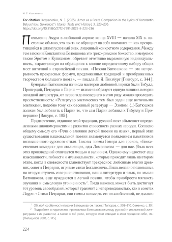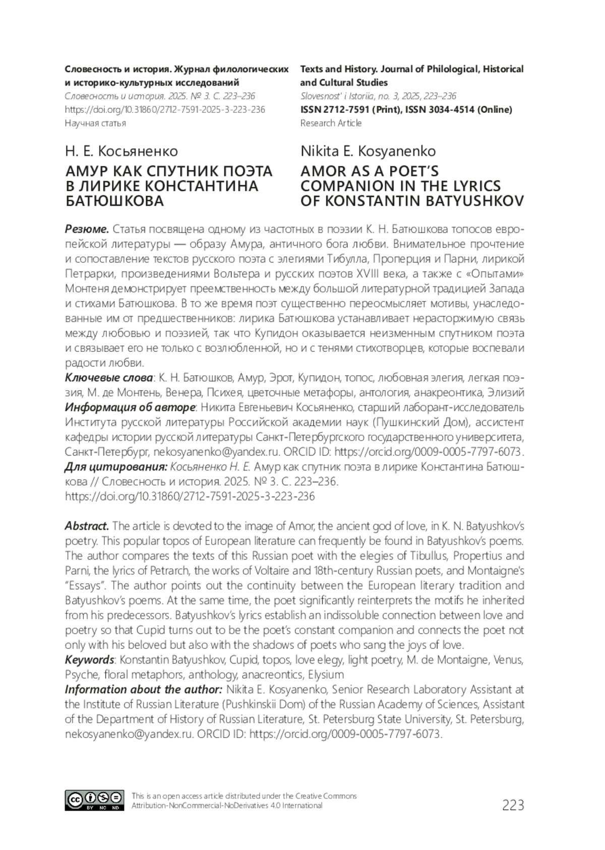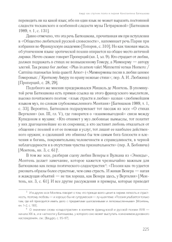 Статья посвящена одному из частотных в поэзии К. Н. Батюшкова топосов европейской литературы — образу Амура, античного бога любви. Внимательное прочтение и сопоставление текстов русского поэта с элегиями Тибулла, Проперция и Парни, лирикой Петрарки, произведениями Вольтера и русских поэтов XVIII века, а также с «Опытами» Монтеня демонстрирует преемственность между большой литературной традицией Запада и стихами Батюшкова. В то же время поэт существенно переосмысляет мотивы, унаследованные им от предшественников: лирика Батюшкова устанавливает нерасторжимую связь между любовью и поэзией, так что Купидон оказывается неизменным спутником поэта и связывает его не только с возлюбленной, но и с тенями стихотворцев, которые воспевали радости любви