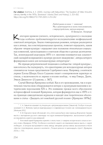 В статье на примере анализа произведения Виктора Кривулина «Путешествие рядом с Батюшковым» (1978) и отрывка из его научной работы 1960-х гг. «О библейских мотивах у Батюшкова» представлена попытка переосмысления литературной идентичности неофициального поэта в 1970-е гг. Делается вывод о том, что обращение к фигуре Батюшкова актуализирует в творчестве андеграундного автора вопрос пересборки канона и помогает определить его отношение к историко-литературному процессу, где Батюшков воспринимается в неотрывной связи с Баратынским, а фигура Пушкина практически исключается. Кривулин, вслед за героем «Путешествия рядом с Батюшковым», видит схожесть в устройстве художественного мира, судьбе Батюшкова и Баратынского и выбирает одинаковые способы разговора об этих поэтах