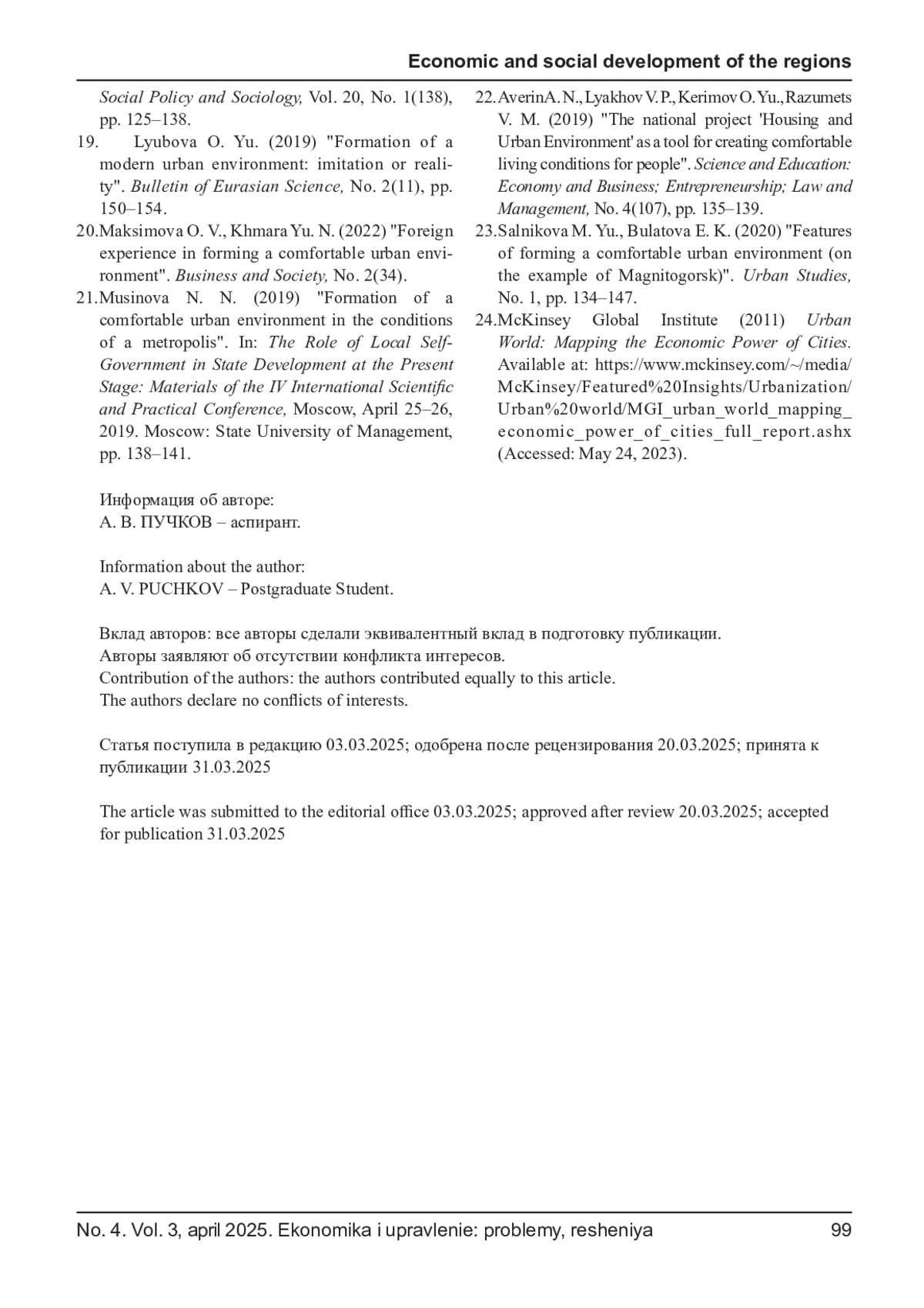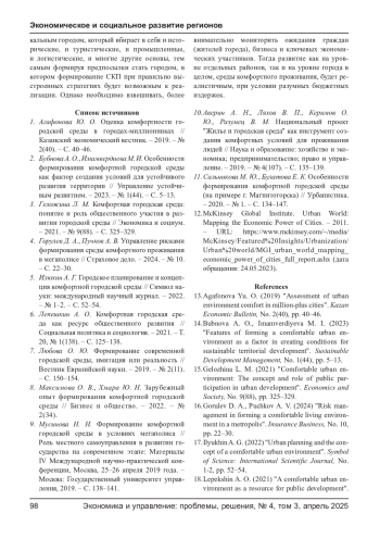 3. Геложина Л. М. Комфортная городская среда: понятие и роль общественного участия в развитии городской среды // Экономика и социум. - 2021. - № 9(88). - С. 325-329. EDN: XGLYEN