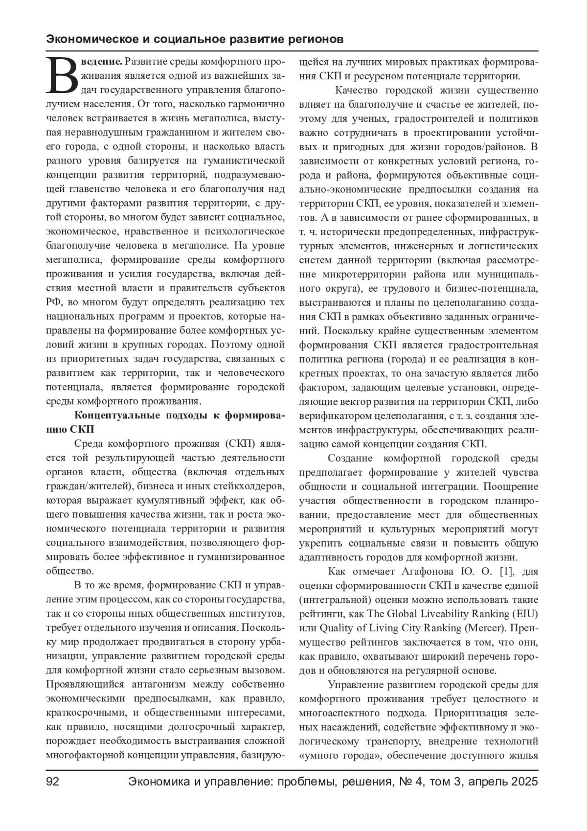 1. Агафонова Ю. О. Оценка комфортности городской среды в городах-миллионниках // Казанский экономический вестник. - 2019. - № 2(40). - С. 40-46.