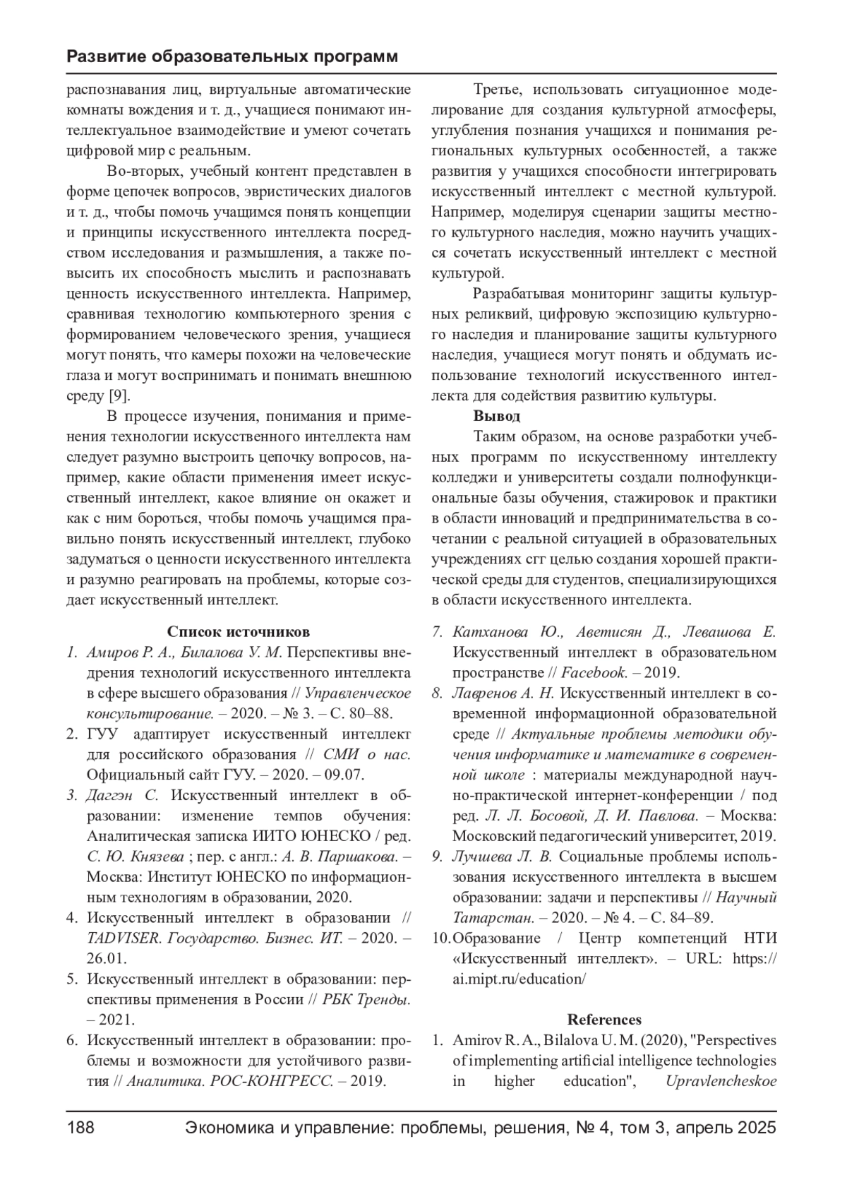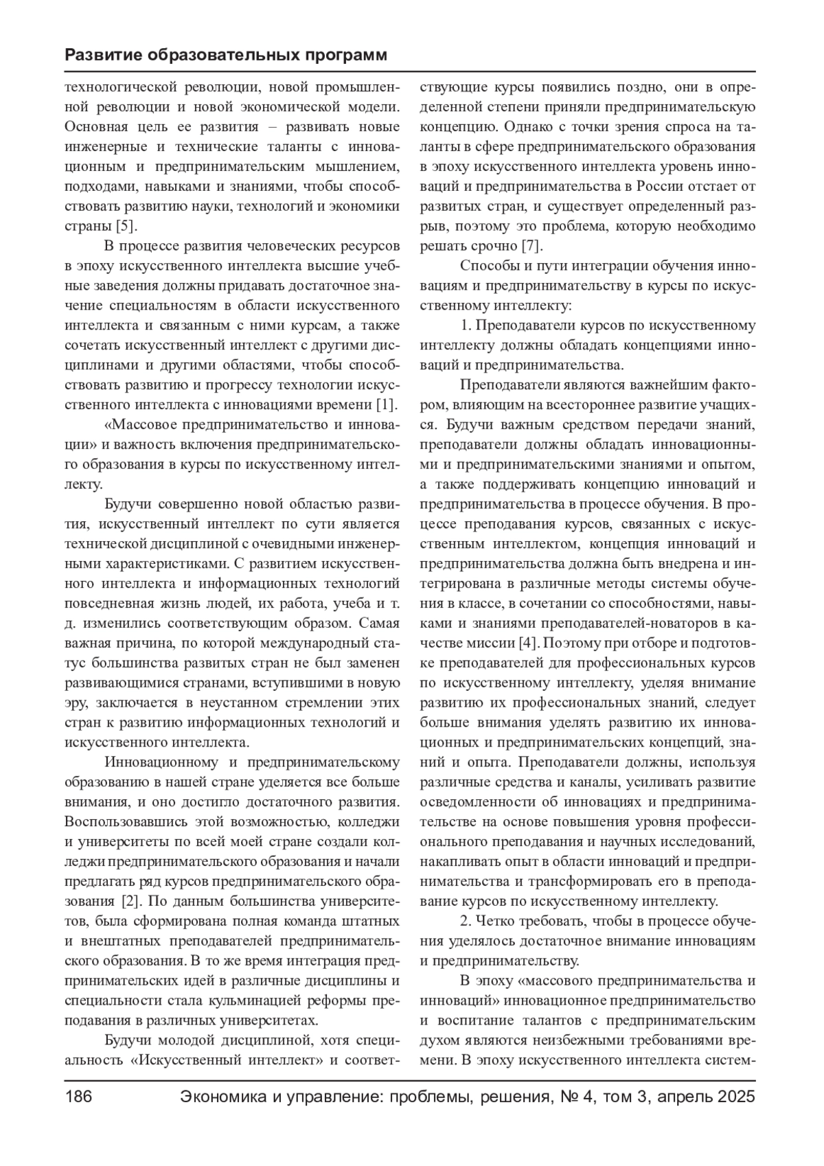 КОСУЛИН В. В., БАКАШЕВ Э. Д., БАРКЕНХОЕВА Р. А. НАПРАВЛЕНИЯ ПОСТРОЕНИЯ И РАЗВИТИЯ КУРСОВ ПО ИСКУССТВЕННОМУ ИНТЕЛЛЕКТУ В КОНТЕКСТЕ ПРЕДПРИНИМАТЕЛЬСКОГО ОБРАЗОВАНИЯ // ЭКОНОМИКА И УПРАВЛЕНИЕ: ПРОБЛЕМЫ, РЕШЕНИЯ. 2025. ТОМ 3 № 4