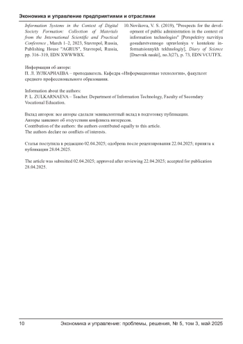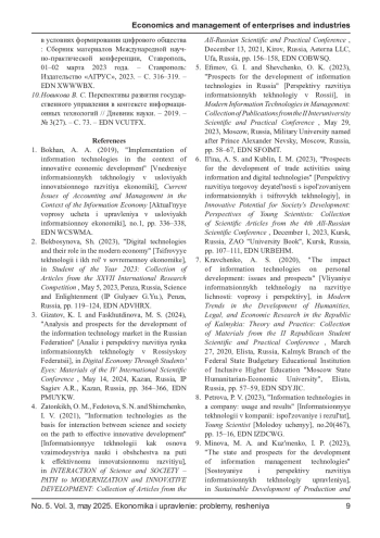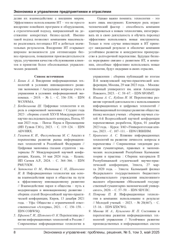 9. Минова М. А., Кузьменко И. П. Состояние и перспективы развития информационных технологий управления // Устойчивое развитие производственных и информационных систем в условиях формирования цифрового общества: Сборник материалов Международной научно-практической конференции, Ставрополь, 01-02 марта 2023 года. - Ставрополь: Издательство “АГРУС”, 2023. - С. 316-319. EDN: XWWWBX