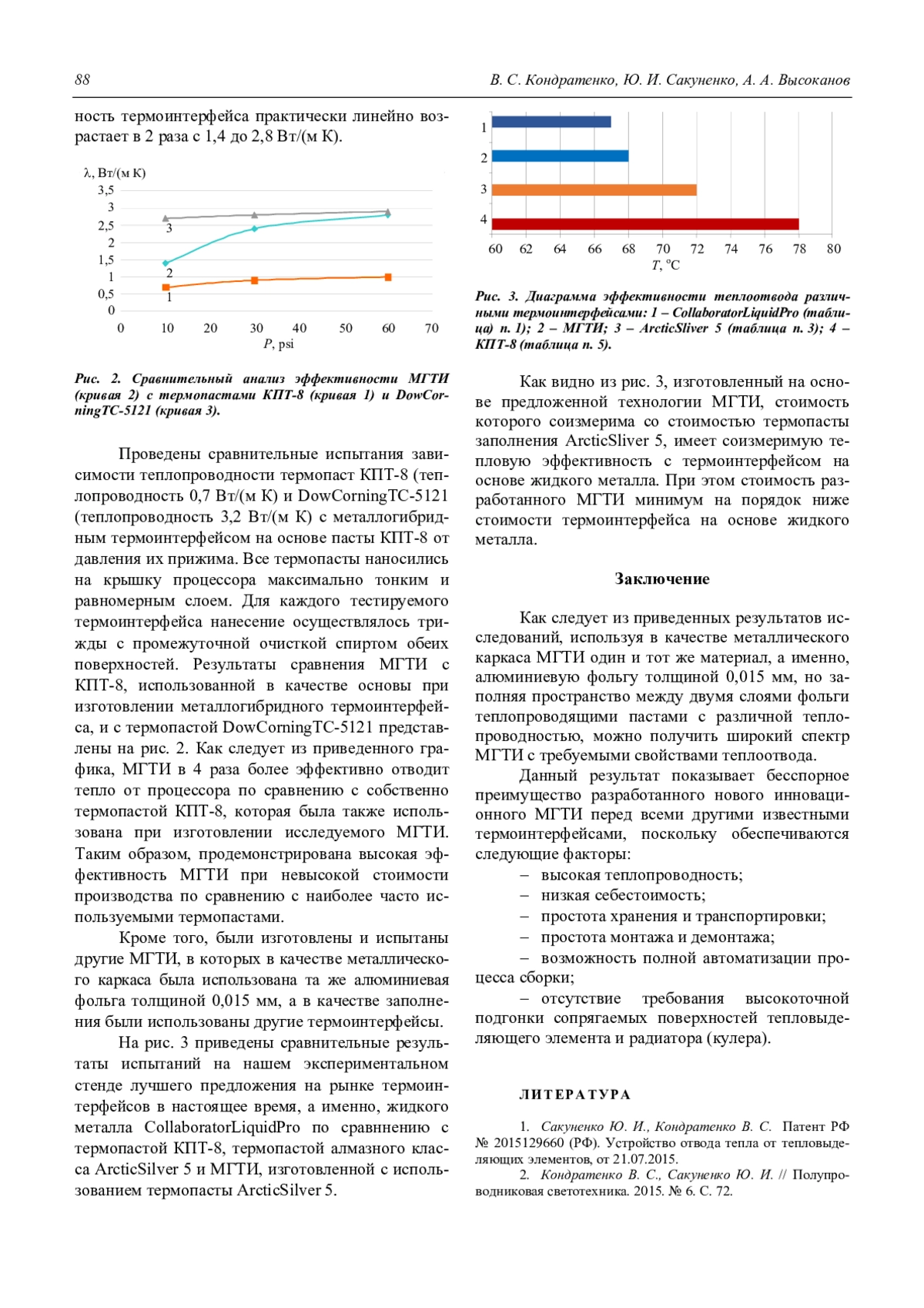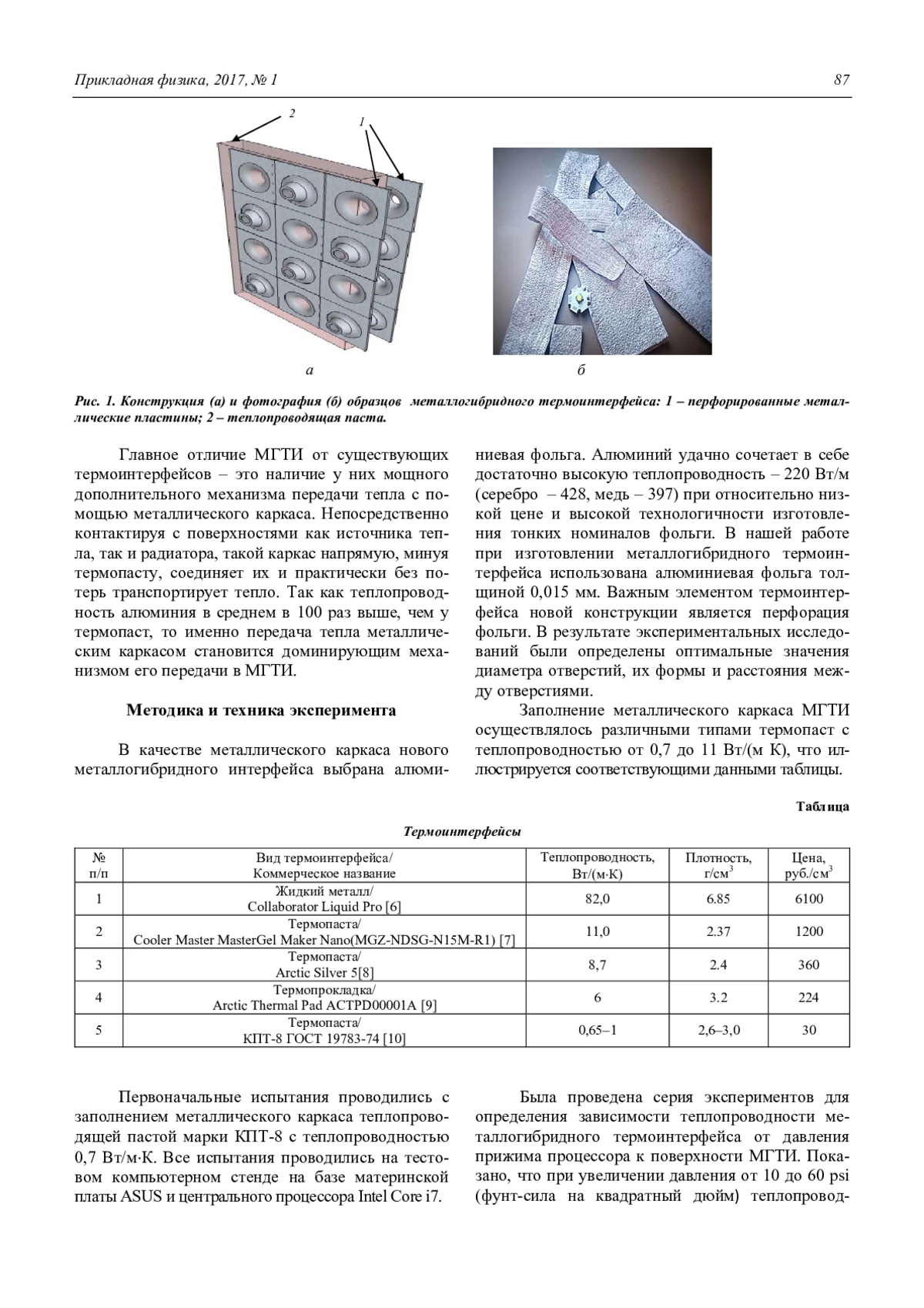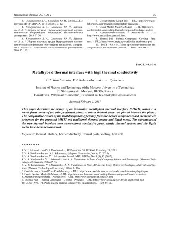 КОНДРАТЕНКО В. С., САКУНЕНКО Ю. И., ВЫСОКАНОВ А. А. МЕТАЛЛОГИБРИДНЫЕ ТЕРМОИНТЕРФЕЙСЫ С ВЫСОКОЙ ТЕПЛОПРОВОДНОСТЬЮ // ПРИКЛАДНАЯ ФИЗИКА. 2017. №1