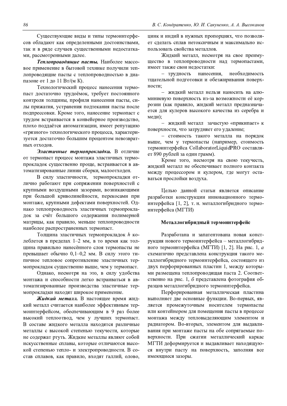 В данной работе описана инновационная конструкция металлогибридного термоинтерфейса (МГТИ), представляющая собой металлический каркас, выполненный из двух тонких перфорированных пластин, между которыми размещена теплопроводящая паста. Приведены сравнительные результаты эффективности теплоотвода от нагреваемых в процессе эксплуатации различных компонентов и элементов для предлагаемого МГТИ, традиционных теплопроводящих паст и жидкого металла. Показаны преимущества нового термоинтерфейса перед традиционными теплопроводящими пастами, эластичными термопрокладками и жидким металлом.