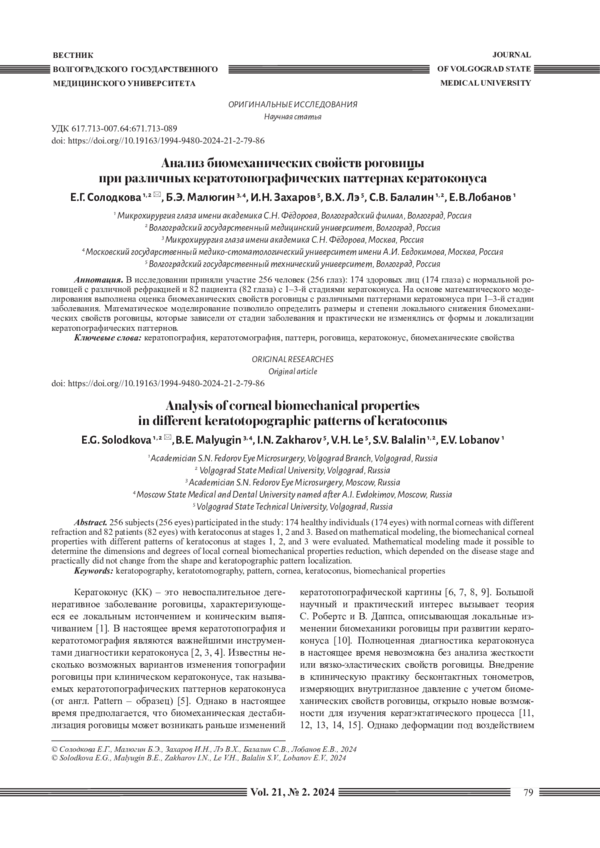 Солодкова Е.Г., Малюгин Б.Э., Захаров И.Н. и др. Разработка комплекса математических моделей биомеханических параметров роговицы с диагностированным керато-конусом до и после лечения кросслинкингом роговичного коллагена. Российский журнал биомеханики. 2022;3:10-28. DOI: 10.15593/RZhBiomeh/2022.3.01 EDN: HCQFDP -