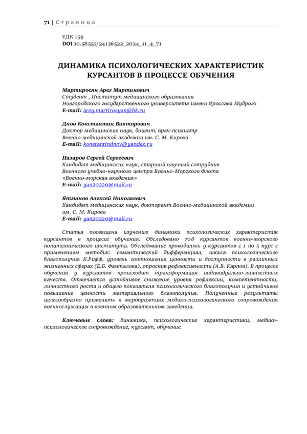 Статья посвящена изучению динамики психологических характеристик курсантов в процессе обучения. Обследовано 708 курсантов военно-морского политехнического института. Обследование проводилось у курсантов с 1 по 5 курс с применением методик: семантический дифференциал, шкала психологического благополучия К.Рифф, уровень соотношения ценности и доступности в различных жизненных сферах (Е.Б. Фанталова), опросник рефлексивности (А.В. Карпов). В процессе обучения у курсантов происходит трансформация индивидуально-личностных качеств. Отмечается устойчивое снижение уровня рефлексии, компетентности, личностного роста и общего показателя психологического благополучия и устойчивое повышение ценности материального благополучия. Полученные результаты целесообразно применять в мероприятиях медико-психологического сопровождения военнослужащих в военном образовательном заведении.