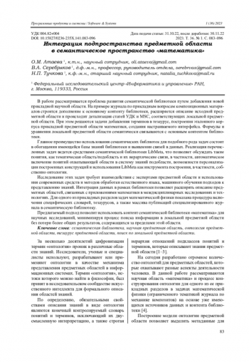Serebryakov V.A., Ataeva O.M. Ontology based approach to modeling of the subject domain quot;Mathematicsquot; in the digital library. Lobachevskii J. of Math., 2021, vol. 42, no. 8, pp. 1920ndash;1934. DOI: 10.1134/S199508022108028X EDN: EGGXVQ -