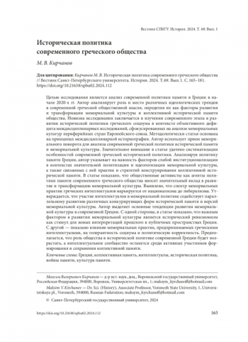 Целью исследования является анализ современной политики памяти в Греции в начале 2020-х гг. Автор анализирует роль и место различных идеологических трендов в современной греческой общественной мысли, определяя их как факторы развития и трансформации мемориальной культуры и коллективной исторической памяти общества. Новизна исследования заключается в изучении современного этапа в развитии исторической политики греческого социума в контексте объективного дефицита междисциплинарных исследований, сфокусированных на анализе мемориальных культур периферийных стран Европейского союза. Методологически статья основана на принципах междисциплинарной историографии. Автор использует прием мемориального поворота для анализа современной греческой политики исторической памяти и мемориальной культуры. Значительное внимание в статье уделено систематизации особенностей современной греческой исторической политики. Анализируя политику памяти Греции, автор указывает на важность факторов слабой институционализации в контекстах значительной политизации и идеологизации мемориальной культуры, а также связанных с ней практик и стратегий конструирования коллективной исторической памяти. В статье показано, что общественные активисты как агенты политики памяти современного греческого общества вносят значительный вклад в развитие и трансформацию мемориальной культуры. Выявлено, что спектр мемориальных практик греческих интеллектуалов варьируется от национализма до либерализма. Утверждается, что участие интеллектуалов в мемориальной политике содействует параллельному развитию различных конкурирующих форм исторической памяти и версий мемориальной культуры. Автор выделяет основные тенденции развития мемориальной культуры в современной Греции. С одной стороны, в статье показано, что важным фактором в развитии мемориальной культуры является исторический ревизионизм как стимул для новых интерпретаций прошлого в публичных пространствах Греции. С другой - показано влияние мемориальных практик, предпринимаемых греческими интеллектуалами, на толерантность социума и политическую корректность. Предполагается, что роль общества в исторической политике современной Греции будет возрастать, а интеллектуальное сообщество останется среди активных участников формирования и сохранения коллективной памяти.