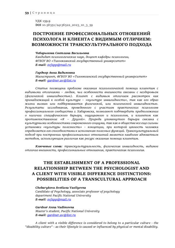 Статья посвящена проблеме оказания психологической помощи клиентам с видимыми отличиями – людям, чьи особенности внешности связаны с нездоровьем (физической инвалидностью). Клиент с видимым отличием рассмотрен как принадлежащий к особой культуре – «культуре инвалидности», так как его образ жизни вызван или поддерживается физической, или психической инвалидностью. Результаты исследования, проведенного с участием практических психологов профессионального сообщества г. Хабаровска, позволяют подтвердить предположение о наличии специфического барьера, ощущаемого и психологом, и клиентом как противопоставление «Я – Другой». Природа упомянутого барьера связана с культурными особенностями современного социума, так как в обществе все еще сильны установки «культуры полезности» – концепции, при которой ценность человека определяется его способностями к исполнению полезных функций. Транскультуральный подход при построении профессиональных отношений является наиболее адекватным методом, использующим различия как ресурс оказания помощи клиентам.