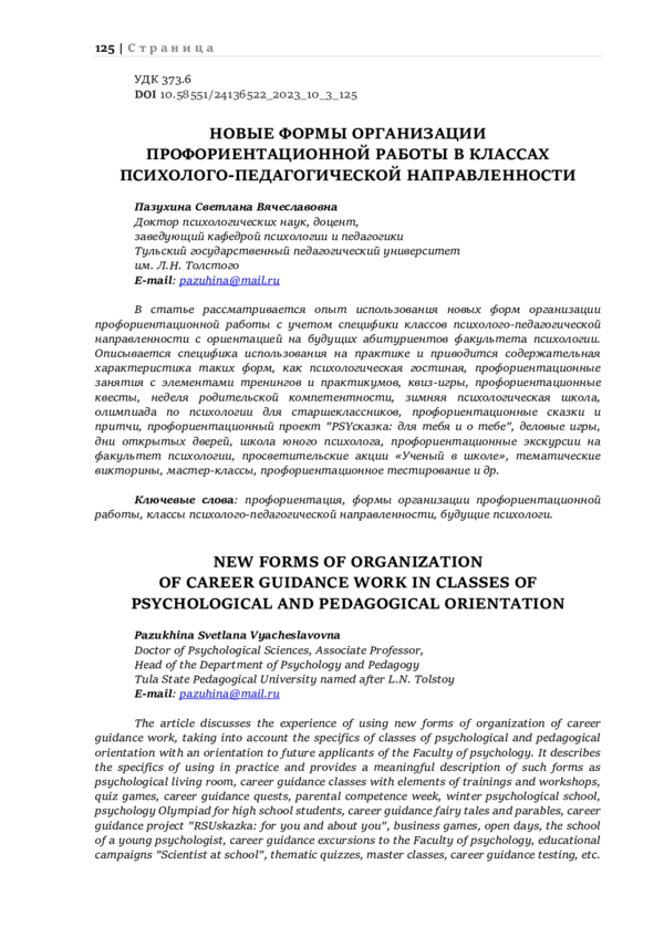 В статье рассматривается опыт использования новых форм организации профориентационной работы с учетом специфики классов психолого-педагогической направленности с ориентацией на будущих абитуриентов факультета психологии. Описывается специфика использования на практике и приводится содержательная характеристика таких форм, как психологическая гостиная, профориентационные занятия с элементами тренингов и практикумов, квиз-игры, профориентационные квесты, неделя родительской компетентности, зимняя психологическая школа, олимпиада по психологии для старшеклассников, профориентационные сказки и притчи, профориентационный проект “PSYсказка: для тебя и о тебе”, деловые игры, дни открытых дверей, школа юного психолога, профориентационные экскурсии на факультет психологии, просветительские акции «Ученый в школе», тематические викторины, мастер-классы, профориентационное тестирование и др.