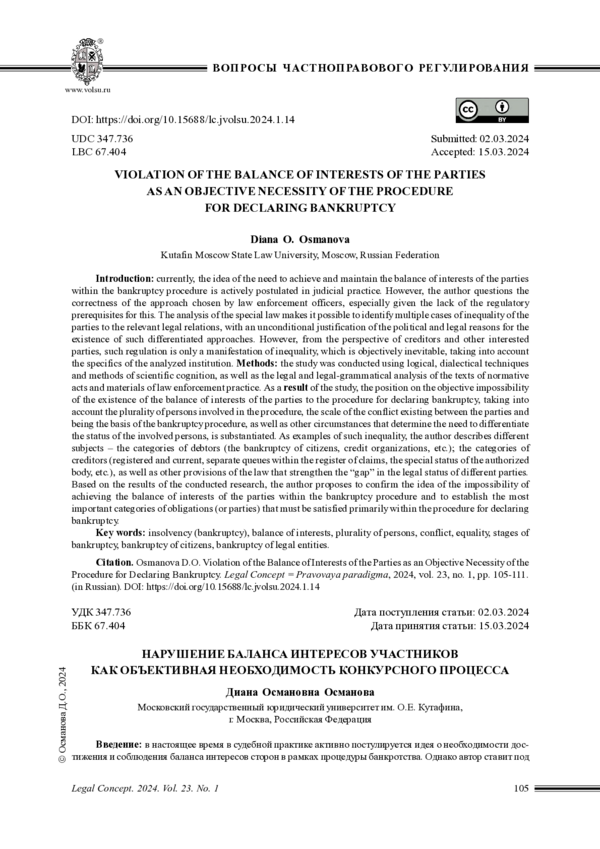 Рубцова, Н. В. Обеспечение баланса частноправовых и публично-правовых интересов в процессе несостоятельности (банкротства) / Н. В. Рубцова // Хозяйство и право. - 2022. - № 2. - С. 75-83. EDN: YXFBUP