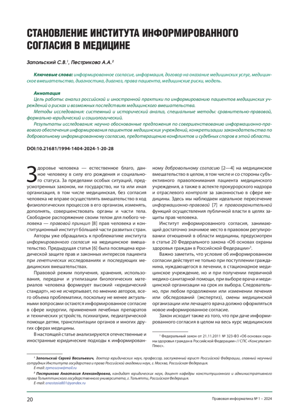- Запольский С.В., Пестрикова А.А. Информированное согласие на медицинское вмешательство: правовой аспект // Правовая информатика. 2023. № 2. С. 6-13. DOI: 10.21681/1994-1404-2023-2-6-13 EDN: FOTCKC