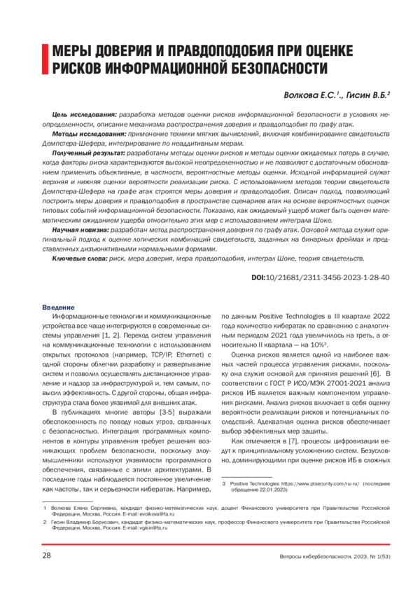 Волкова Е.С., Гисин В.Б. Оценка рисков информационной безопасности на основе теории свидетельств Демпстера-Шефера. В "Информационная безопасность финансово-кредитных организаций в условиях цифровой трансформации экономики", С.И.Козьминых ред., 2020. С. 89-101. -
