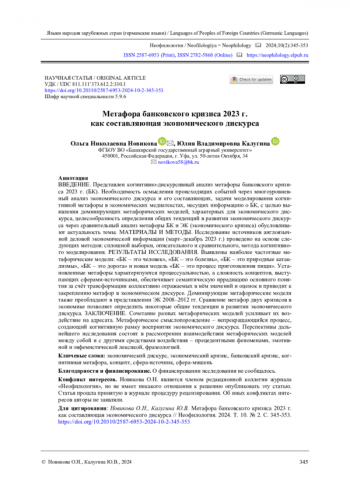 ВВЕДЕНИЕ. Представлен когнитивно-дискурсивный анализ метафоры банковского кризиса 2023 г. (БК). Необходимость осмысления происходящих событий через многоуровневный анализ экономического дискурса и его составляющих, задачи моделирования когнитивной метафоры в экономических медиатекстах, несущих информацию о БК, с целью выявления доминирующих метафорических моделей, характерных для экономического дискурса, целесообразность определения общих тенденций в развитии экономического дискурса через сравнительный анализ метафоры БК и ЭК (экономического кризиса) обусловливают актуальность темы.