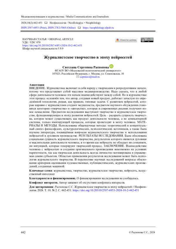 ВВЕДЕНИЕ. Журналистика включает в себя наряду с творческим и репродуктивное начало, потому что представляет собой массовое медиапроизводство. Надо сказать, что в любой сфере деятельности человека эти начала взаимодействуют между собой. Но в журналистике этот процесс осложнён тем, что автор, создавая новый продукт, работает зачастую по определённой технологии, решая, как правило, типовые задачи. С развитием нейросетей, которые наравне с журналистами создают медиатексты, предметом научного обсуждения становятся категории «творчества» и «авторства», которые в современных реалиях получают новое осмысление. Предметом исследования выступают творчество и журналистское творчество, функционирующее в эпоху развития нейросетей. Цель – раскрыть сущность творчества, которое может существовать как продукт деятельности человека, а не компьютерной системы, только имитирующей процессы, которые происходят в мозгу человека.