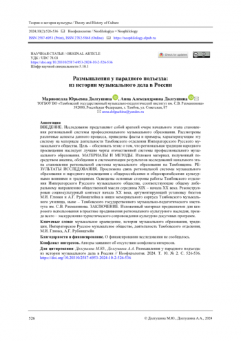 ВВЕДЕНИЕ. Исследование представляет собой краткий очерк начального этапа становления региональной системы профессионального музыкального образования. Рассмотрены различные аспекты данного процесса, приведены факты и примеры, характеризующие эту систему на материале деятельности Тамбовского отделения Императорского Русского музыкального общества. Цель – обосновать тезис о том, что региональная традиция народного просвещения наследует лучшие черты отечественной системы профессионального музыкального образования.
