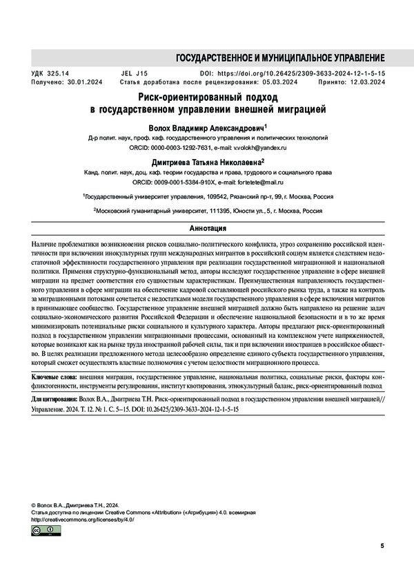 ДМИТРИЕВА Т. Н., ВОЛОХ В. А. РИСК-ОРИЕНТИРОВАННЫЙ ПОДХОД В ГОСУДАРСТВЕННОМ УПРАВЛЕНИИ ВНЕШНЕЙ МИГРАЦИЕЙ // УПРАВЛЕНИЕ. 2024. Т. 12 № 1