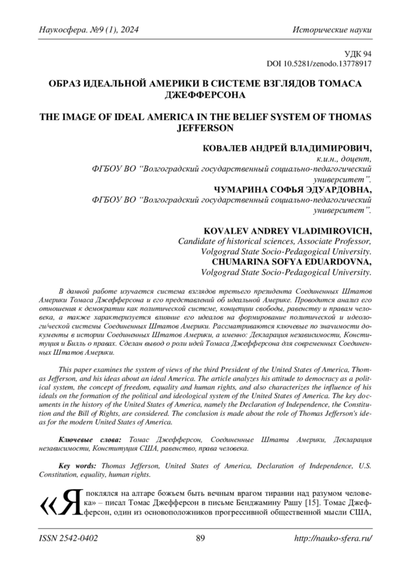 КОВАЛЕВ А. В., ЧУМАРИНА С. Э. ОБРАЗ ИДЕАЛЬНОЙ АМЕРИКИ В СИСТЕМЕ ВЗГЛЯДОВ ТОМАСА ДЖЕФФЕРСОНА // НАУКОСФЕРА. 2024. № 9 (1)