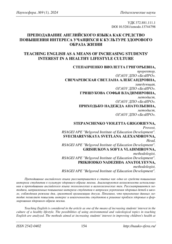 Преподавание английского языка рассматривается в статье как одно из средств повышения интереса студентов к культуре здорового образа жизни. Анализируются возможности использования в преподавании английского языка экологических и валеологических тем. Рассматриваются методики, направленные повышение интереса студентов к вопросам укрепления здоровья детей в школе, соблюдения режима дня, грамотной организации досуга. Показано, что применение данных методик позволяет повысить интерес и вовлеченность студентов в решение проблем здоровья и формирования здорового образа жизни.
