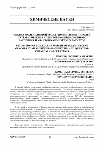 В данной работе реализована комбинация анализа спектров комбинационного рассеяния и квантово-химических расчётов молекул полиэтиленгликолей. Обоснована значимость разработки точных и быстрых методов контроля структуры полиэтиленгликолей. Выявлены сферы применения материалов на основе полимеров. Предложен метод оценки молекулярной массы полиэтиленгликолей, основанный на анализе смещения линий спектра КР. Для нахождения чувствительных линий проведён квантово-химический расчёт в некоммерческой программе «Природа». Проанализированы сдвиги трёх спектральных линий, чувствительных к изменению молекулярной массы.