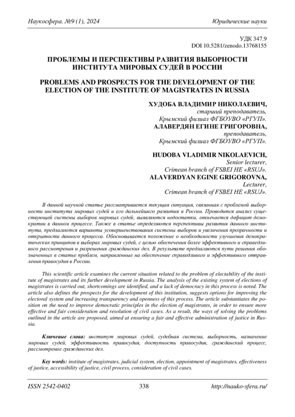 ХУДОБА В. Н., АЛАВЕРДЯН Е. Г. ПРОБЛЕМЫ И ПЕРСПЕКТИВЫ РАЗВИТИЯ ВЫБОРНОСТИ ИНСТИТУТА МИРОВЫХ СУДЕЙ В РОССИИ // НАУКОСФЕРА. 2024. № 9 (1)