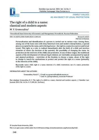 Персонализация и идентификация человека осуществляется различными способами. Среди них, в числе одного из базовых, имеющих глубокие исторические корни и современное прочтение, особое место занимает имя, а в юридическом смысле - право на имя (в узком и широком смысле). Данное право, как правило, реализуется сразу после рождения ребенка и предполагает элементы выбора (решением родителей), возможность изменения имени, его охрану (в интересах ребенка) и защиту. На любом из означенных этапов традиционные аспекты развертывания соответствующих правоотношений неизбежно сопровождаются типичными и нетипичными проблемами - ограничением свободы выбора имени, злоупотреблением правом на его изменение, поиском механизмов охраны и защиты права на имя (прежде всего в интересах ребенка).