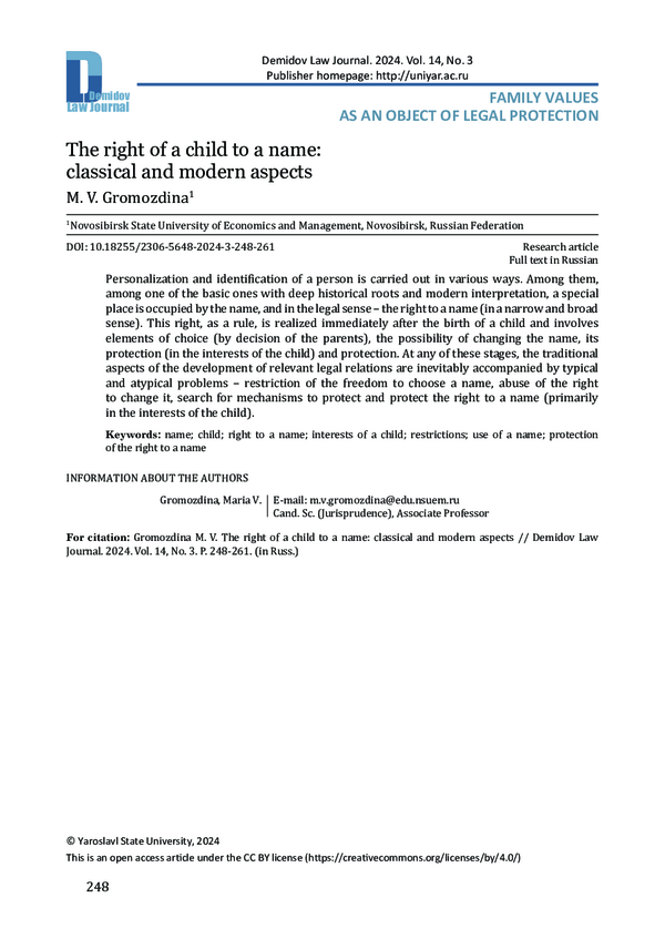 Громоздина М. В. Изменение фамилии ребенка: правовые основания и проблемы реализации права // Социально-юридическая тетрадь. 2021. № 11. С. 45-55. EDN: NFXRQI -