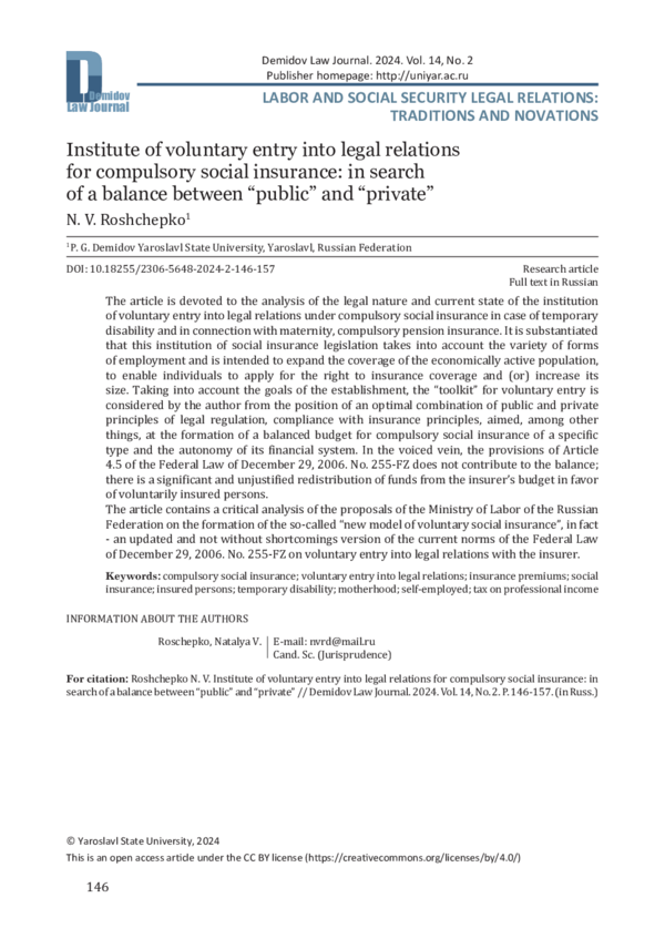 Статья посвящена анализу правовой природы и современного состояния института добровольного вступления в правоотношения по обязательному социальному страхованию на случай временной нетрудоспособности и в связи с материнством, обязательному пенсионному страхованию. Обосновано, что данный институт социально-страхового законодательства учитывает разнообразие форм занятости и призван расширить охват экономически активного населения, дать возможность лицам в заявительном порядке сформировать права на страховое обеспечение и (или) повысить его размер. При этом «инструментарий» добровольного вступления рассматривается автором с позиции оптимального сочетания публичных и частных начал правового регулирования, соблюдения страховых принципов, направленных в том числе на формирование сбалансированного бюджета средств обязательного социального страхования конкретного вида и автономности его финансовой системы. В озвученном ключе положения ст. 4.5 Федерального закона от 29.12.2006г. № 255-ФЗ балансу не способствуют, наблюдается существенное и неоправданное перераспределение средств бюджета страховщика в пользу добровольно застрахованных лиц. Статья содержит критический анализ предложений Минтруда РФ о формировании так называемой «новой модели добровольного социального страхования», на деле - обновленной и не лишенной недостатков версии действующих норм Федерального закона от 29.12.2006 г. № 255-ФЗ о добровольном вступлении в правоотношения со страховщиком.