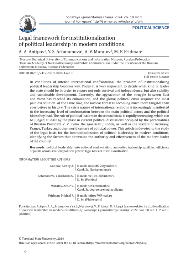 В условиях интенсивного международного противостояния проблема институционализации политического лидерства становится ключевой. Сегодня очень важно определиться с тем, каким должен быть руководитель государства, чтобы обеспечить стране не только выживание, независимость, но и стабильность, устойчивое развитие. В настоящее время обострение борьбы Востока и Запада достигло своей кульминации, и мировой политический кризис требует максимально безболезненного решения. Вместе с тем ядерная угроза становится гораздо более ощутимой, чем когда бы то ни было в истории. Кризисный характер международных отношений все чаще проявляется в повышении уровня конфронтации между основными политическими акторами и возглавляемыми ими политическими блоками. Роль политических лидеров в этих условиях стремительно возрастает, о чем можно судить хотя бы по тому, какое место в нынешних политических дискуссиях занимают личности российского президента В. В. Путина, американского - Дж. Байдена, а также лидеров ФРГ, Франции, Турции и других мировых центров политической силы. Данная статья посвящена изучению правовых основ институционализации политического лидерства в современных условиях, выяснению факторов, определяющих авторитет и эффективность современного руководителя страны.