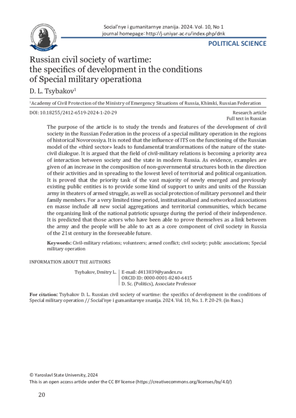 Целью статьи выступает исследование тенденций и особенностей развития гражданского общества Российской Федерации в процессе Специальной военной операции в регионах исторической Новороссии. Отмечается, что влияние СВО на функционирование российской модели «третьего сектора» ведет к принципиальным трансформациям характера государственно-гражданского диалога. Аргументируется, что приоритетной сферой взаимодействия общества и государства в современной России становится область военно-гражданских отношений. В качестве доказательства приводятся примеры увеличение состава негосударственных структур как по направленности их деятельности, так и в распространении на самый низовой уровень территориально-политической организации. Обосновывается, что приоритетной задачей подавляющего большинства вновь возникших и существовавших ранее общественных субъектов становится оказание той или иной поддержки подразделениям и частям российской армии на театрах вооруженной борьбы, а также социальная защита военнослужащих и членов их семей. На протяжении весьма ограниченного временного срока институционализированные и сетевые объединения в массовом порядке включают в себя все новые социальные агрегации и территориальные сообщества, которые стали организующим звеном народного патриотического подъема в период СВО. Прогнозируется, что те субъекты, которые смогли проявить себя в качестве связующего звена между армией и народом, способны в обозримом будущем выступать стержневым компонентом гражданского общества в России ХХI столетия.