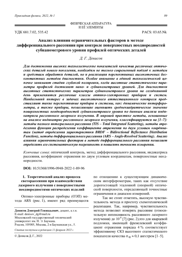 Для достижения высоких технологические показателей качества различных оптических деталей нового поколения, необходим не только современный подход к методам и средствам обработки деталей, но и реализация перспективных высокоточных бесконтактных методов диагностики. Особое внимание в единой технологической цепочке занимают стадии глубокой полировки, когда высотные статистические параметры профилей достигают нано- и субнанометровых уровней. Для диагностики высотных статистических параметров субнанометрового уровня на сегодняшний день применяются различные классы оптико-электронных приборов и систем. Наибольший интерес в задачах высокоточного аттестационного контроля представляют такие перспективные приборы и системы, как: динамические интерферометры, а также приборы, позволяющие оценивать среднеквадратическое значение поверхностных неоднородностей субнанометрового уровня по данным анализа индикатрисы рассеянного лазерного излучения. В мировой практике методы, основанные на анализе индикатрис рассеянного лазерного излучения, классифицируются на [1–7]: методы полного интегрального рассеяния (TIS – Total Integrated Scattering), методы определения функции распределения коэффициента отражения по двум угловым координатам (метод определения характеристики BRDF – Bidirectional Reflectance Distribution Func-tion), методы дифференциального рассеяния (ARS – Angle-Resolved Scattering). Анализ влияния ограничительных факторов в методе дифференциального рассеяния позволяет определить его систематическую погрешность и повысить точность измерения.