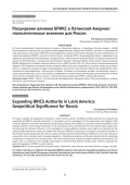 В статье анализируется геополитическая ситуация в Латинской Америке и Карибском бассейне (далее — ЛАКБ). Рассматриваются перспективы расширения межгосударственного объединения БРИКС в регионе и преимущества этой организации для страны ЛАКБ. На основе выдвинутых авторами критериев проводится анализ возможных сценариев расширения БРИКС в контексте стратегических интересов РФ на международной арене, определяются направления для наиболее благоприятного сотрудничества и обеспечения интересов России в условиях напряженной политической обстановки и развернутой коллективным Западом гибридной войны против нашей страны. Значение БРИКС повышается в условиях изменения баланса сил в ООН, группах G20 и G7 после начала специальной военной операции РФ. Теоретико-методологической основой работы выступает неореализм, в рамках которого рассматривается и глобальная ситуация в сфере международных отношений, и возможности России для продвижения своих интересов во взаимодействии с различными акторами. Основные используемые методы: ситуационный анализ и анализ документов. Цель статьи заключается в определении стратегических преимуществ для реализации внешнеполитических интересов России в связи с потенциальным расширением БРИКС в Латинской Америке.