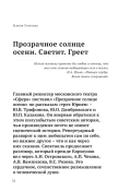 Главный режиссер московского театра «Сфера» поставил «Прозрачное солнце осени» по рассказам «трех Юриев» – Ю. В. Трифонова, Ю. О. Домбровского и Ю. П. Казакова. Он впервые обратился к этим полузабытым советским авторам, чьи произведения почти не имеют сценической истории. Репертуарный разворот к ним любопытен сам по себе, но важнее другое – что и как через них сказано. Спектакль продолжает разговор, который прежде Коршунов вел через А. Н. Островского, А. П. Чехова, А. В. Вампилова, В. С. Розова. Это сердечное, сочувственное размышление о человеческой душе.