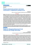 Предмет. Фонды целевого капитала во всем мире генерируют значимую часть средств для финансирования деятельности учреждений высшего профессионального образования. Эндаумент-фонды университетов — это некоммерческие институты долгосрочного или бессрочного функционирования, капитал которых формируется за счет пожертвований с целью его дальнейшего инвестирования и получения дохода, направляемого на уставные цели вузов. Цель. В основе работы лежит сравнительный анализ моделей управления целевым капиталом эндаументов российских и зарубежных университетов, где, в зависимости от соотношения целевых показателей риска и доходности, применяются различные стратегии: от консервативных — с традиционными финансовыми инструментами до высокорискованных — со значительной долей вложений в инновационные стартапы. Актуальность. В нашей стране эндаумент-фонды, рассматриваются в первую очередь как механизм, обеспечивающий стабильный финансовый поток на долгосрочную перспективу при минимальных рисках, контролируемых на законодательном уровне. Выводы. Активизация процесса привлечения средств в эндаументы российских вузов путем вложения «длинных денег» в инновационные проекты высшей научной школы (по примеру Стэнфордской модели) может способствовать росту экономики. Но для этого необходимо преодолеть существующие проблемы, такие как: нестабильность входящего денежного потока; недостаточный опыт внутриуниверситетских структур по аккумуляции капитала; ограничения, налагаемые на использование инструментов инвестирования; непостоянство уровня расходования денежных поступлений.