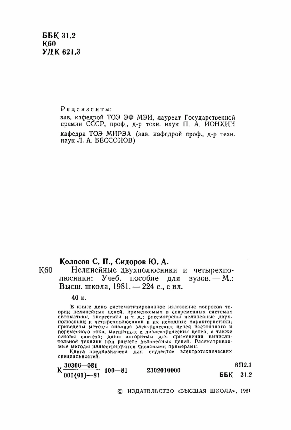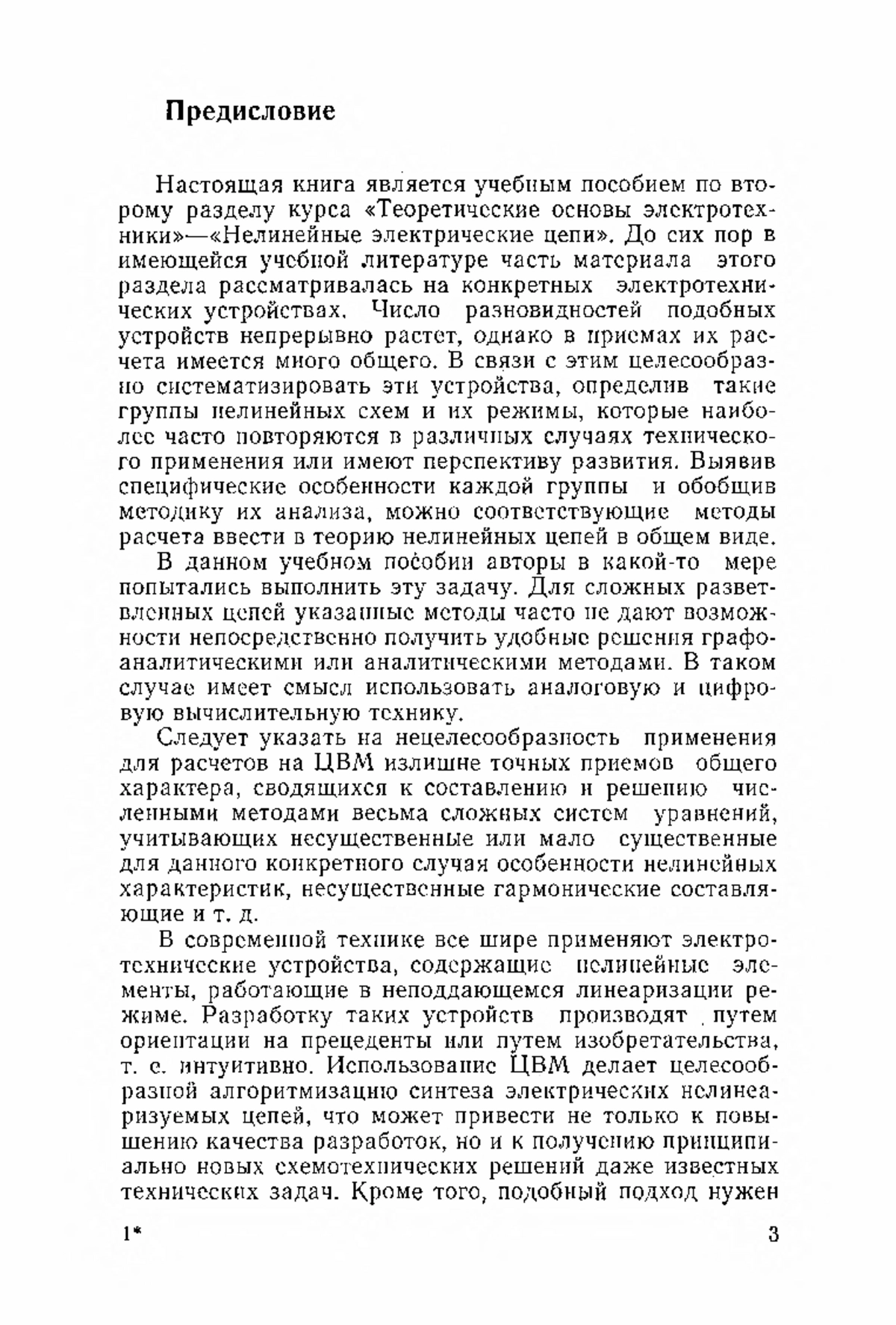 В книге дано систематизированное изложение вопросов теории нелинейных цепей, применяемых в современных системах автоматики, энергетики и т.д.; рассмотрены нелинейные двухполюсники и четырехполюсники и их исходные характеристики; приведены методы анализа электрических цепей постоянного и переменного тока, магнитных и диэлектрических цепей, а также основы синтеза; даны алгоритмы для применения вычислительной техники при расчете нелинейных цепей. Рассматриваемые методы иллюстрируются числовыми примерами. Книга предназначена для студентов электротехнических специальностей.