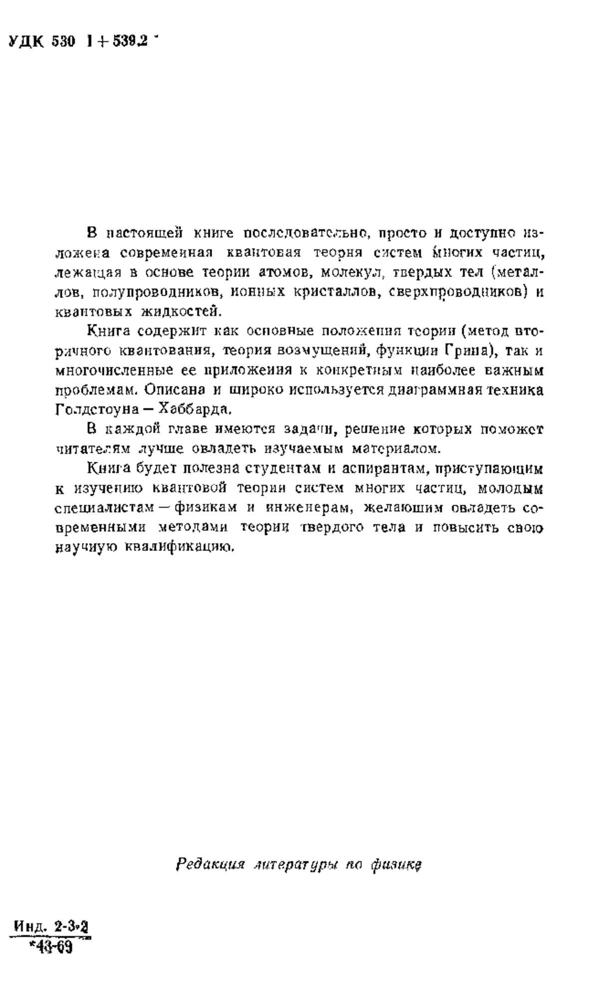 Книга будет полезна студентам и аспирантам, приступающим к изучению квантовой теории систем многих частиц, молодым специалистам — физикам и инженерам, желающим овладеть современными методами теории твердого тела и повысить свою научную квалификацию.