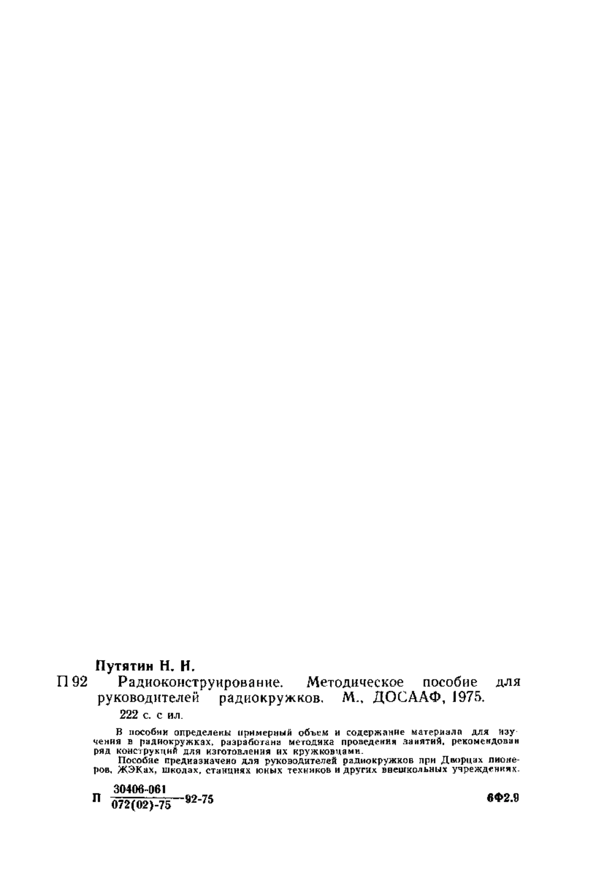 Радиолюбительство — массовая школа подготовки кадров для нужд обороны страны. Тысячи радиолюбителей за обеспечение радиосвязи на фронтах Великой Отечественной войны награждены орденами и медалями, а многие из них удостоены высокого звания Героя Советского Союза. Юные радиолюбители строят приемники и радиоузлы, радиофицируют школы и пионерские лагеря, конструируют приборы для физических кабинетов школ, работают на коллективных радиостанциях, помогают ученым в проведении массовых исследовательских работ. В пособии определены примерный объем и содержание материала для изучения в радиокружках, разработана методика проведения занятий, рекомендован ряд конструкций для изготовления их кружковцами. Пособие предназначено для руководителей радиокружков при Дворцах пионеров, ЖЭКах, школах, станциях юных техников и других внешкольных учреждениях.