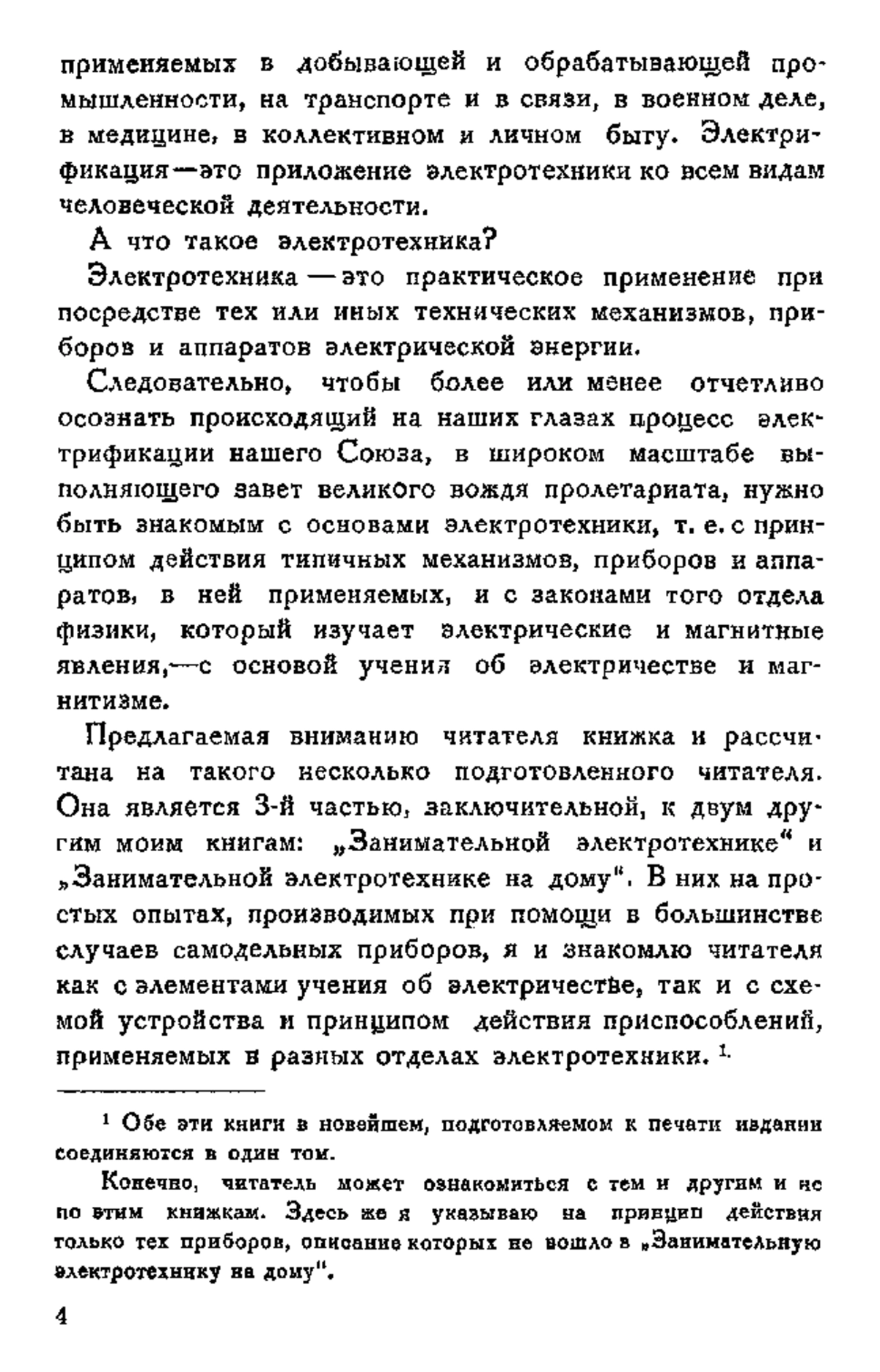 А что такое электротехника? Электротехника — это практическое применение при посредстве тех или иных технических механизмов, приборов и аппаратов электрической энергии. Предлагаемая вниманию читателя книжка и рассчитана на такого несколько подготовленного читателя. Она является 3-й частью, заключительной, к двум другим моим книгам: “Занимательной электротехнике” и “Занимательной электротехнике на дому”. В них на простых опытах, производимых при помощи в большинстве случаев самодельных приборов, автор и знакомит читателя как с элементами учения об электричестве, так и с схемой устройства и принципом действия приспособлений, применяемых в разных отделах электротехники. В этой же книжке, которая имеет и самостоятельный интерес, автор расскажет о необычайном разнообразии практических приложений электричества во всех отраслях человеческой деятельности и выяснит, почему полная электрификация ее немыслима в рамках капиталистического общества.