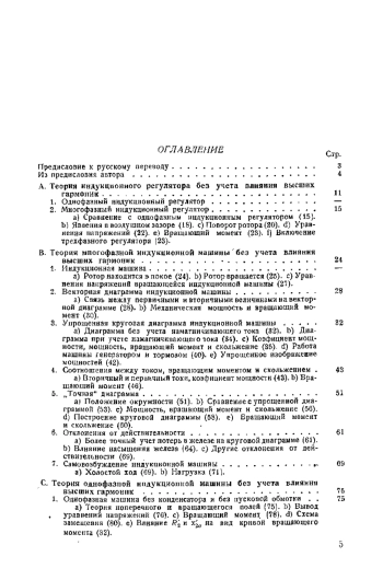 Индукционными называют бесколлекторные машины, относящиеся к группе асинхронных машин. Для большей наглядности и лучшего усвоения физических процессов влияние высших гармоник сперва не учитывается, т. е. изучение теории ведется несколько упрощенным путем, впрочем, вполне достаточным для получения результатов, соответствующих практическим условиям работы. В круг изучаемых вопросов введены также теоретические обоснования работы индукционной машины с самовозбуждением, однофазной машины с емкостью и без нее и различных конструкций двигателей с вытеснением тока. Разделы, рассматривающие пуск в ход, торможение и регулирование числа оборотов, рассчитаны, главным образом, на инженеров, занимающихся проектированием установок, и на инженеров, занятых эксплуатацией машин. В частности, рассмотрены различные методы пуска в ход, с помощью которых можно получить возможно больший начальный момент при малом пусковом токе, плавное и ступенчатое регулирование [с помощью преобразователя частоты, двигатели с двойным ротором, каскадное соединение), а также синхронное вращение нескольких машин. Для инженеров-проектировщиков приведены формулы для определения добавочных потерь в железе и обмотках. Особый раздел посвящен экспериментальному исследованию. В последнем разделе, рассматривающем проектирование индукционных машин, приведен подробный пример расчета.