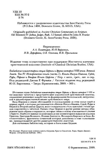 Вход Израиля в землю обетованную и последовавшие за этим эпохи судей и первых царей, о которых рассказывается в Книгах Иисуса Навина, Судей, Руфи и Первой и Второй книгах Царств, могут показаться не столь важными с точки зрения современного читателя. Однако отцы Церкви и другие ранние авторы обнаружили здесь образы и параллели, которые легли в основу новозаветного учения о Христе. Наиболее важные из дошедших до нас комментариев вышли из под пера Оригена, Григория Великого, Иоанна Златоуста, Феодорита Кирского и Беды Достопочтенного, фрагменты сочинений которых дополнены в томе толкованиями, принадлежащими другим раннехристианским экзегетам.