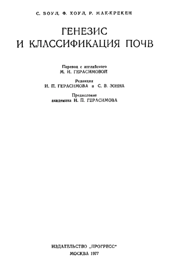 Книга известных американских почвоведов С. Боула, Ф Хоула и Р. Мак-Крекена представляет собой оригинальную работу по почвоведению. В работе даны основы почвоведения и географии почв с точки зрения современной американской школы. В своих исследованиях авторы исходят из учения известного русского ученого В. В. Докучаева.
