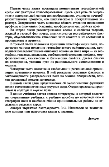 В учебнике, написанном в соответствии с Государственным образовательным стандартом, рассмотрены предмет и задачи географии почв и в более широком плане — почвоведения. Раскрыта роль компонентов географической среды как факторов почвообразования. Дана характеристика состава и свойств твердой, жидкой и газовой фаз почвы. Изложены принципы классификации почв На основе описания географии, генезиса и свойств основных почв мира проанализированы закономерности их распространения и организации строения почвенного покрова Земли. Даны представления о почвенных ресурсах мира, их охране и мелиорации.