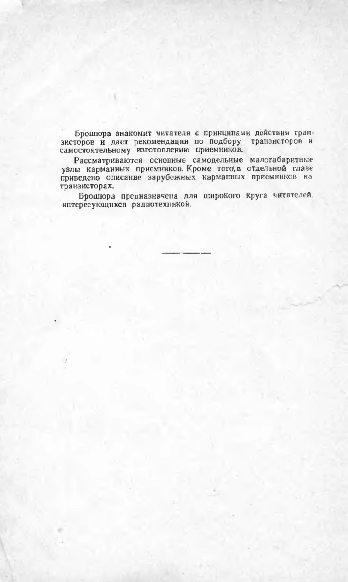 Брошюра знакомит читателя с принципами действия транзисторов и дает рекомендации по подбору транзисторов и самостоятельному изготовлению приемников. Рассматриваются основные самодельные малогабаритные узлы карманных приемников. Кроме того, в отдельной главе приведено описание зарубежных карманных приемников на транзисторах. Брошюра предназначена для широкого круга читателей интересующихся радиотехникой.