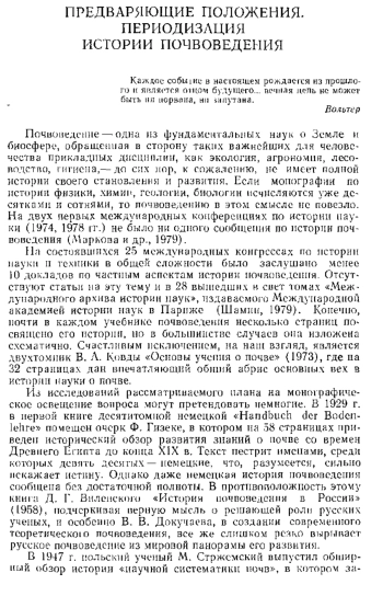 Работа представляет собой первую подробную книгу, посвященную истории почвоведения с древнейших времен до наших дней. В пей рассматривается развитие знаний о почве и эпоху древнейших ирригационных цивилизаций, в Греции и Риме, в феодальный период на Востоке, в Западной Европе и на Руси. Излагаются история почвенных знаний в Европе в XIX в., создание В. В. Докучаевым современного генетического почвоведения, развитие его П. А. Костычевым, Н. М. Сибирцевым, К. Д. Глинкой, роль Вольни, Раманна, Гильгарда в становлении новой науки, бурное развитие почвоведения в СССР, современный рост почвенных исследований в США, Западной Европе, Японии. Выясняются основные тенденции истории почвоведения и дается схема ее периодизации.